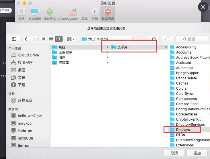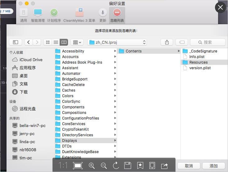 3.在弹出的窗口里选择【系统】-【资源库】-【Displays】-【Contents】-【Resources】-【zh_CN.lproj】,选择该文件夹下的文件,点击【添加】即可。